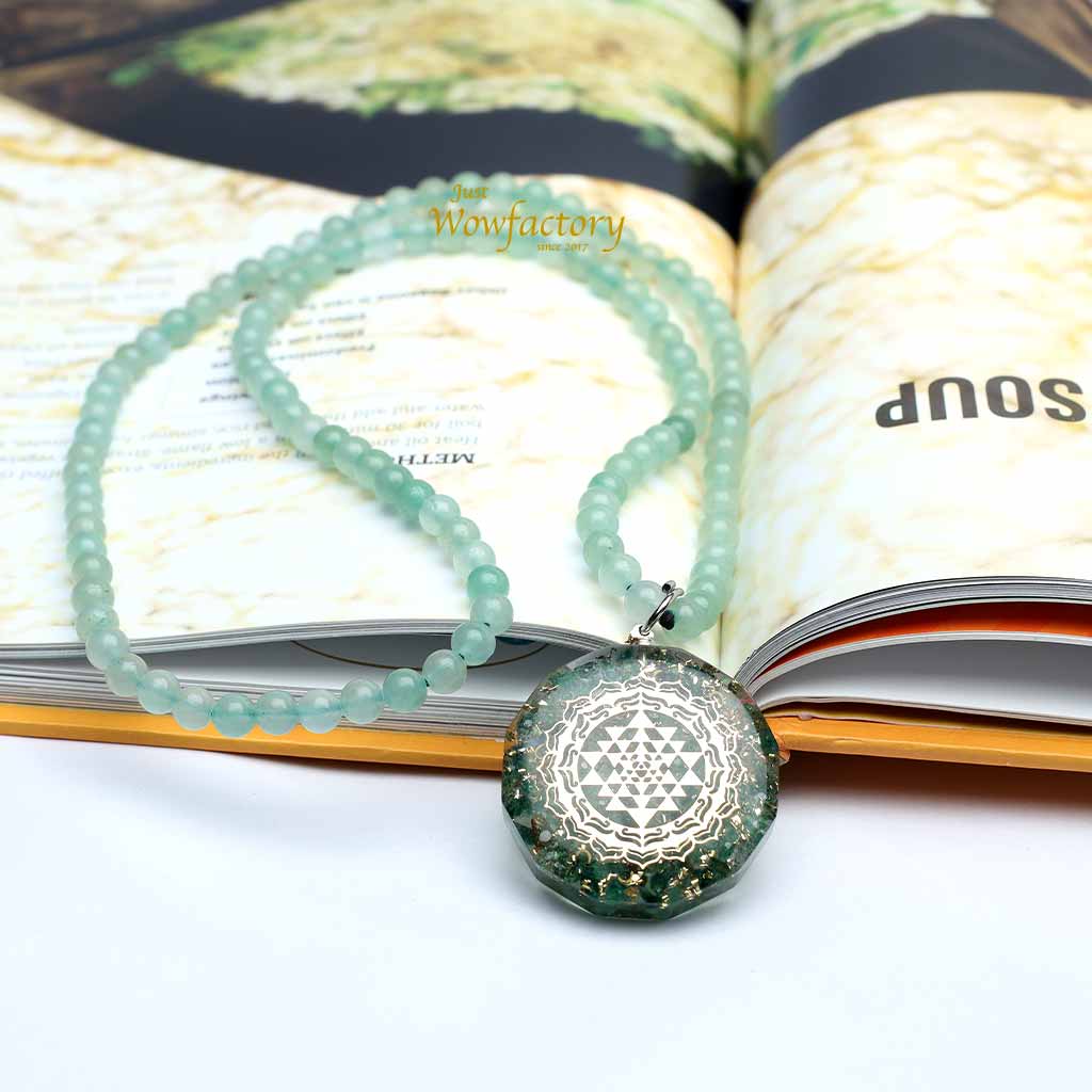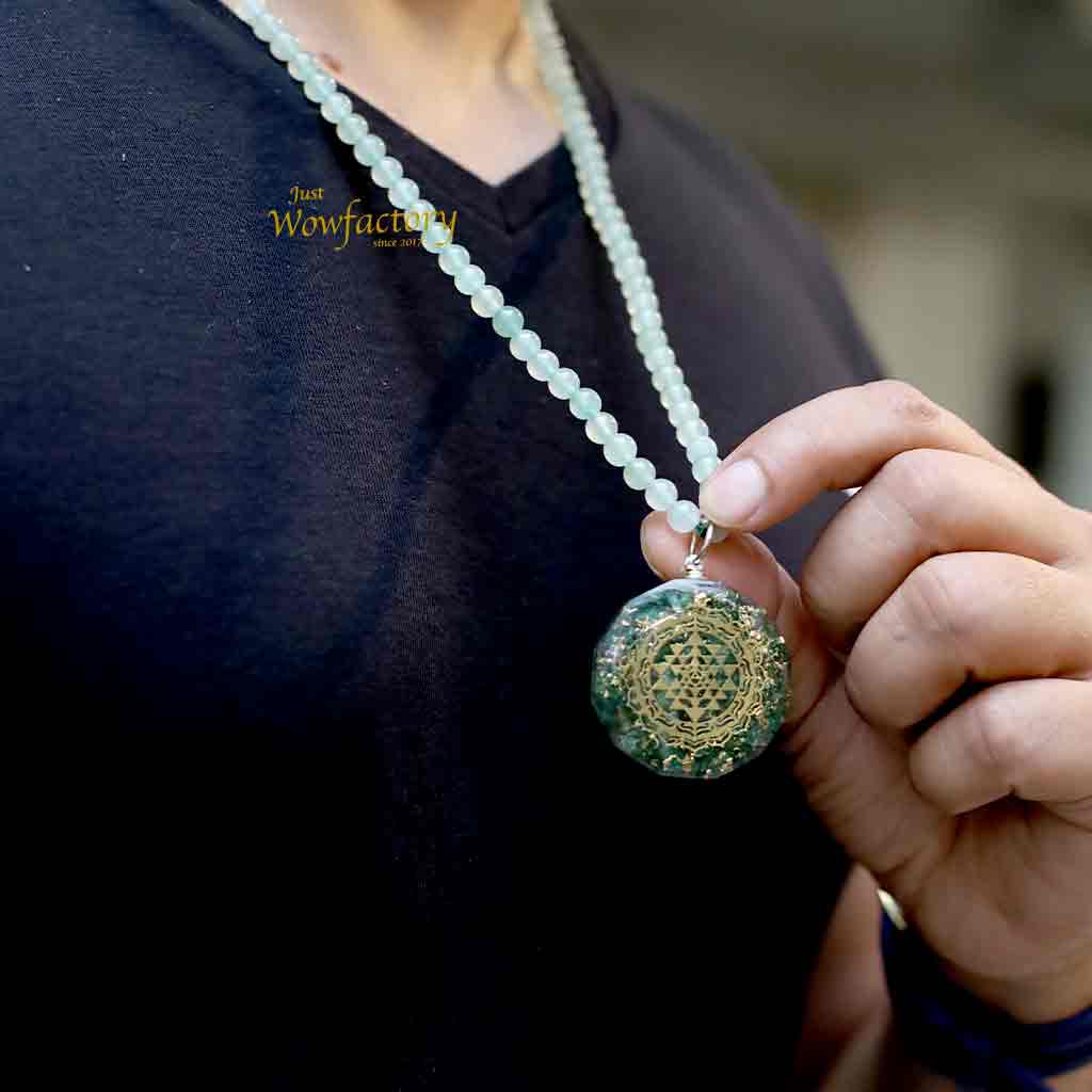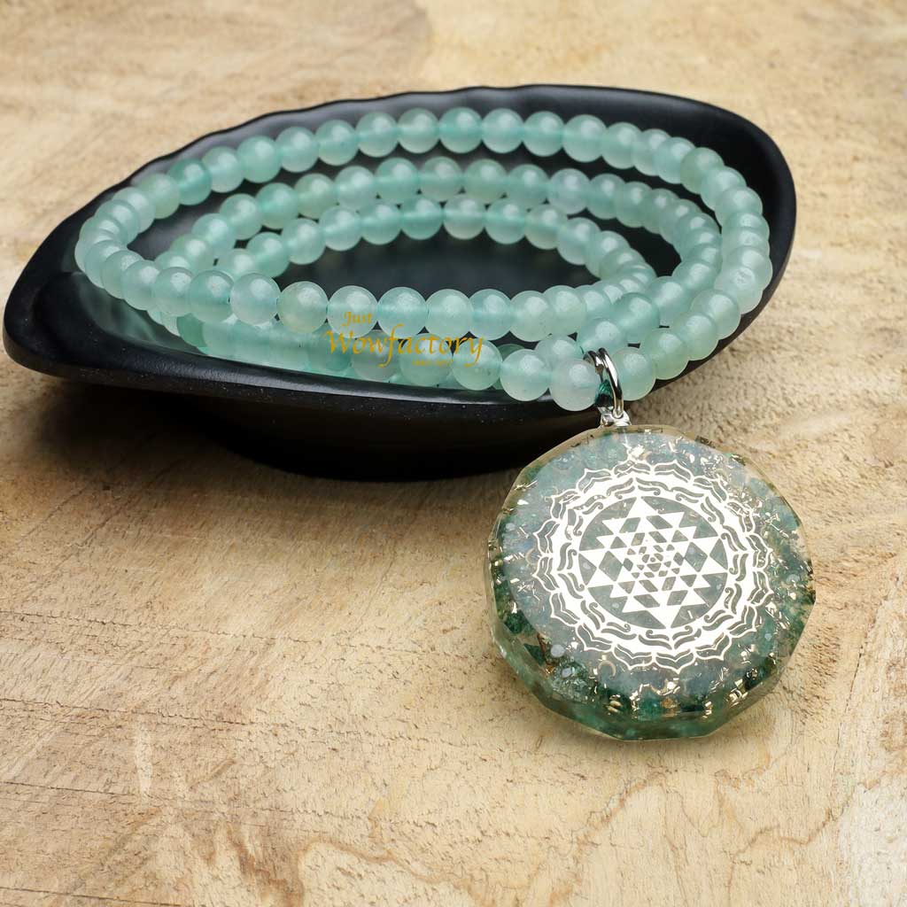 Let the abundance of opulence be showered upon you with light of hope and faith. The improved energy and vitality always emanates when you wear our 108 Sriyantra aventurine mala.