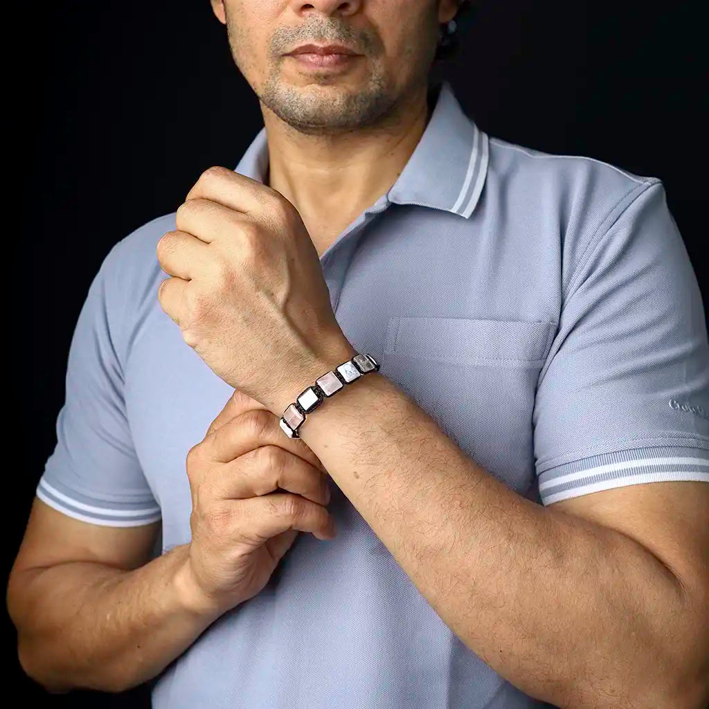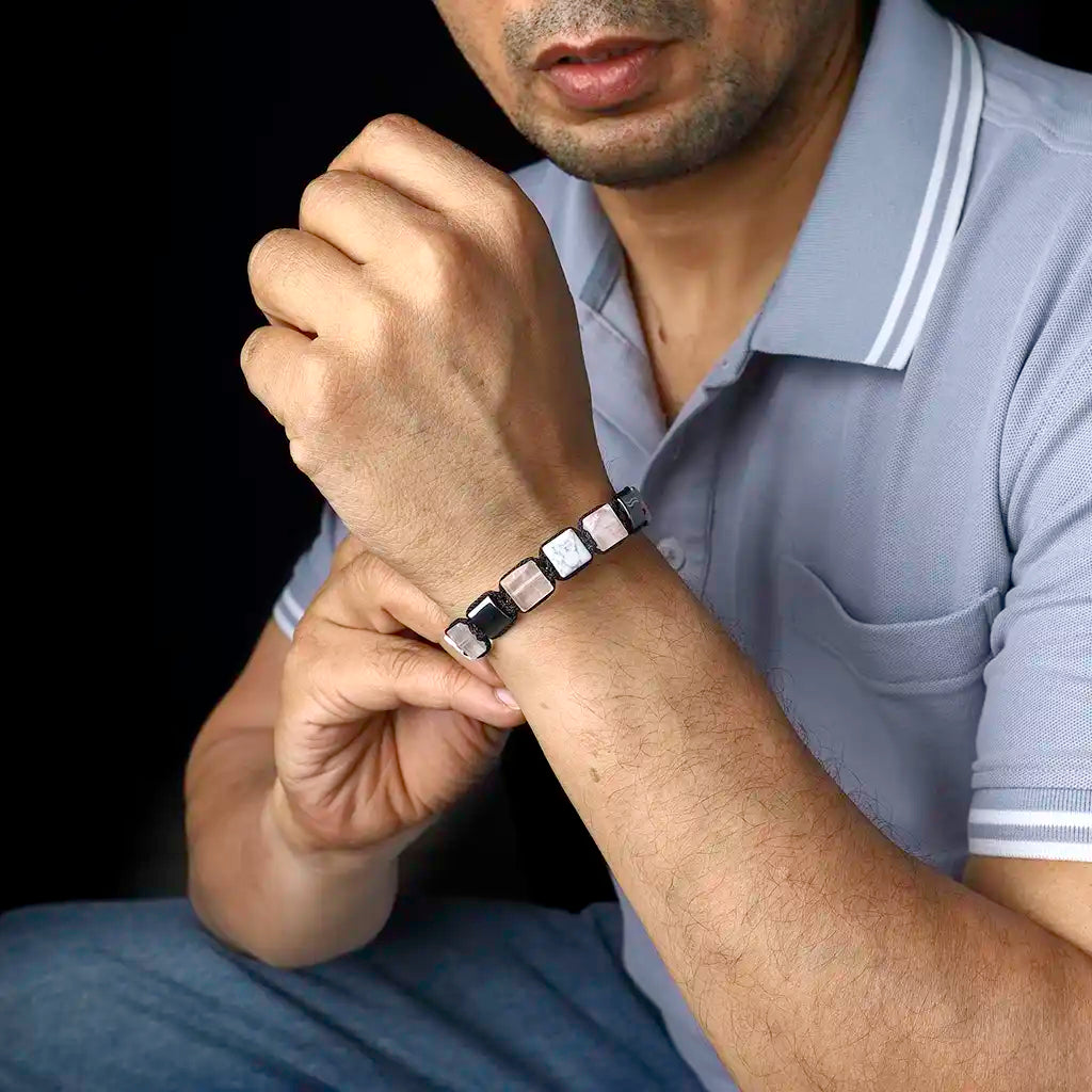 The soothing trio of Moonstone, Rose Quartz, and Howlite in our Cancer thread bracelet and rose quartz, hematite, clear quartz and howlite in flatbead bracelet mirror the depth, intuition, and nurturing essence of this water sign. Thoughtfully handcrafted, these bracelets enhance emotional balance, self-love, and inner peace, helping Cancer navigate life’s tides with grace and resilience.