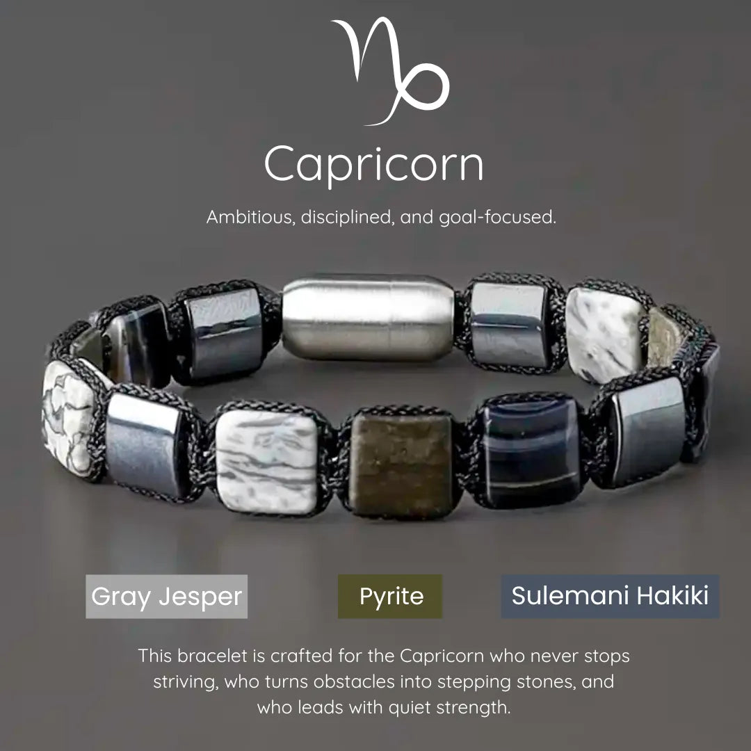 “Capricorn, you are the quiet storm—the one who builds empires not overnight, but with every steady step. This bracelet is your companion in that climb. Let it remind you that even when no one is watching, your efforts are shaping something extraordinary. With every stone, may you feel more grounded, protected, and driven.”