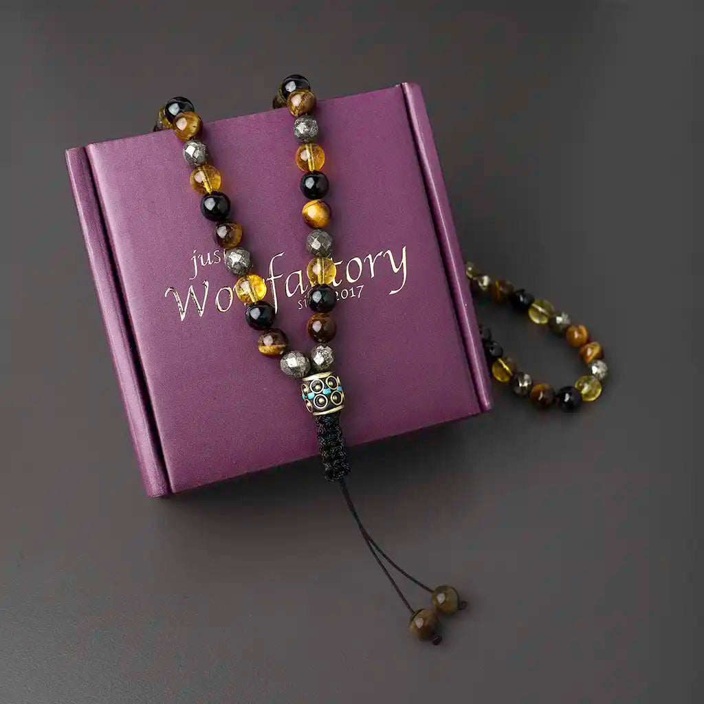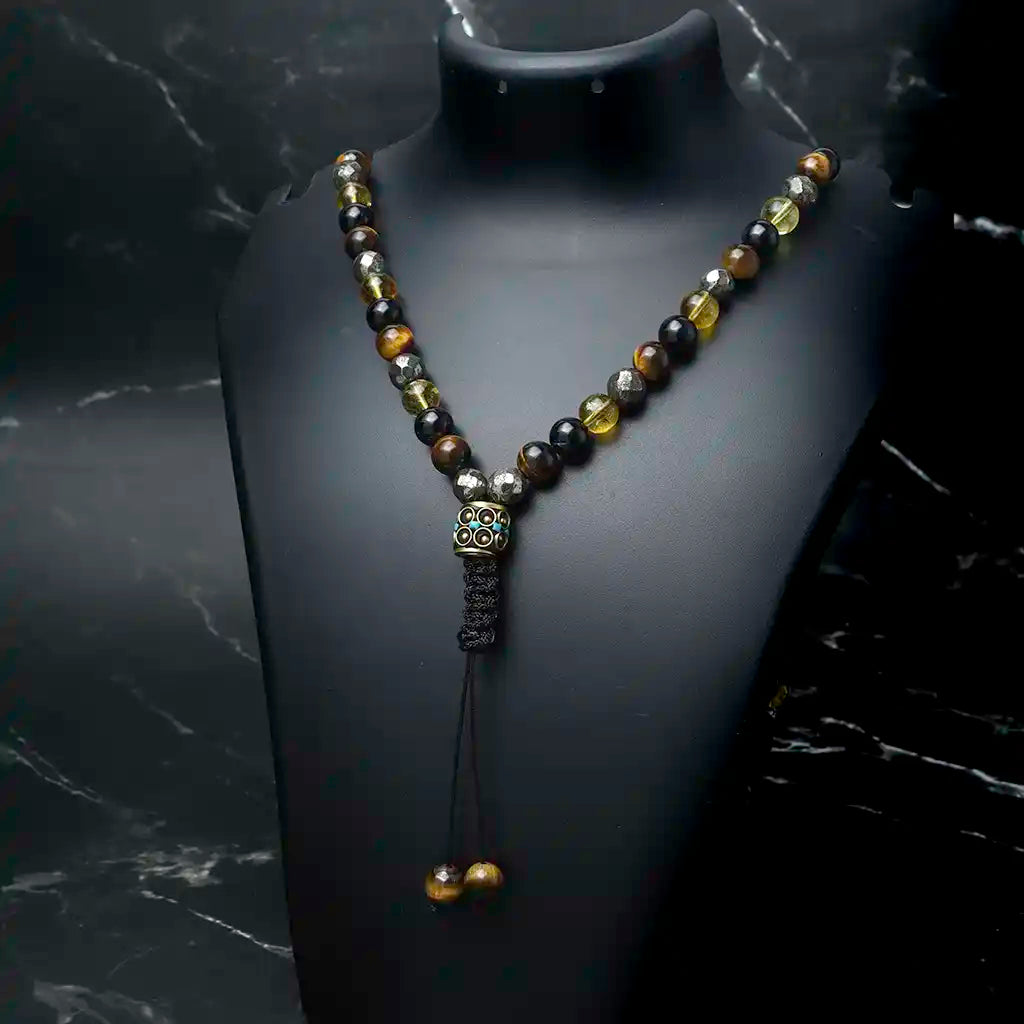 Life’s journey requires both resilience and vision—two qualities embodied in the Tourmaline, Tiger Eye, Citrine, and Pyrite Mala. This Mala is a symbol of your unwavering determination, clarity, and inner strength.