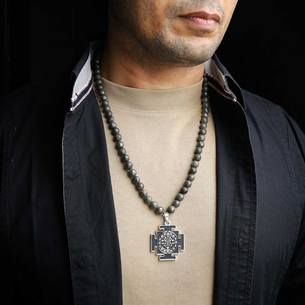 The Wealth Raising Sriyantra pendant Pyrite Mala consists of genuine 7-8mm Pyrite. It is designed to bring in wealth and prosperity, creating an atmosphere of abundance. This mala also helps to increase your focus and productivity. It attracts wealth and prosperity in the life of wearer. Its powerful energy is said to help manifest good fortune and success. The compelling reason to wear this mala is the power of sriyantra and strong metaphysical properties of pyrite, Both are synonymous with wealth and epitomise the affluence and abundance.